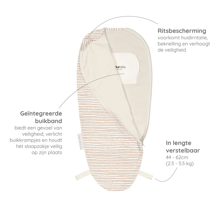 Het gevoel dat de baby binnenin het slaapzakje ervaart, stelt de baby gerust. Het voelt zacht en warm; het doet denken aan al die tijd bij mama in de buik. De armpjes zitten binnen in het slaapzakje. Zo kan de baby zichzelf niet meer wakker slaan.