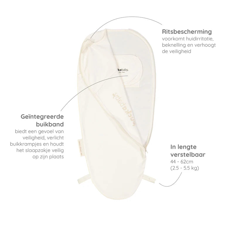 Het gevoel dat de baby binnenin het slaapzakje ervaart, stelt de baby gerust. Het voelt zacht en warm; het doet denken aan al die tijd bij mama in de buik. De armpjes zitten binnen in het slaapzakje. Zo kan de baby zichzelf niet meer wakker slaan.