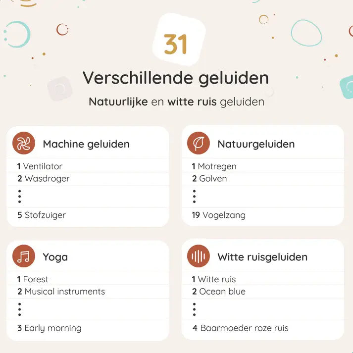 De Numsy Touch is een white noise machine die via het touchscreen makkelijk te bedienen is. Zo stel je dit apparaatje in op één van de 20 geluidsniveau’s en kun je naast white noise kiezen uit 31 andere ontspannende geluiden, waaronder baarmoeder, hartslag en yoga geluiden.